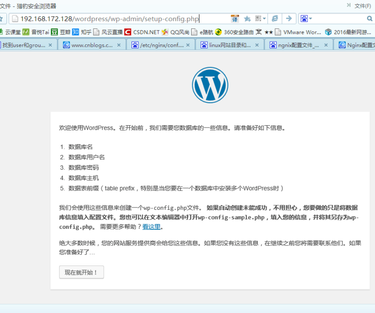 Centos7 中systemd启动php-fpm: #systemctl start php-fpm 之后打开windows 下的web浏览器查看成功页面即可。 PS:如果在点击开始安装的时候,报不能写入问题,编辑vim /etc/php-fpm.d/www.conf找到user和group,改成nginx ,重启php-fpm即可