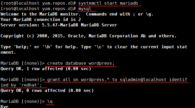 ④配置mariadb,主要是为wordpress创建库,以及授权一个本地登录用户