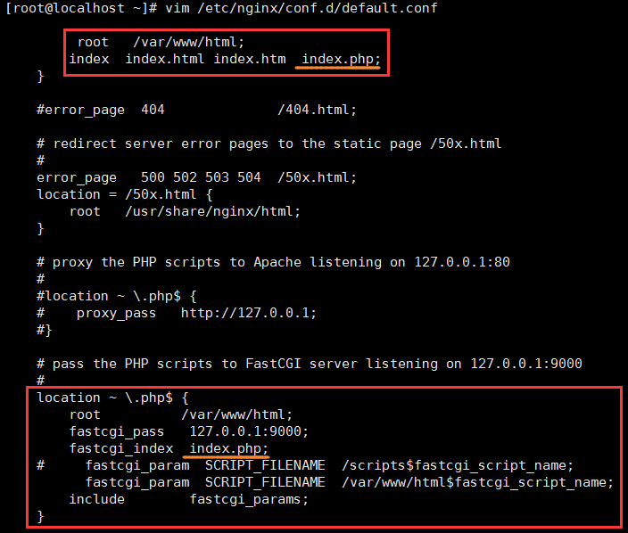 ⑤配置nginx文件,主要的部分已经勾画,开启php-fpm支持。访问网站开始安装。 # vim /etc/nginx/conf.d/default.conf