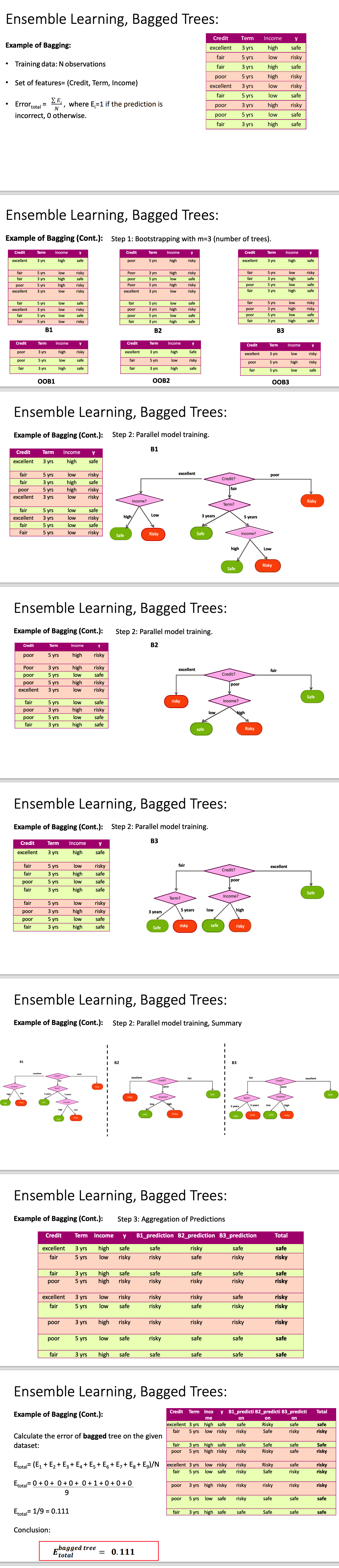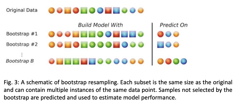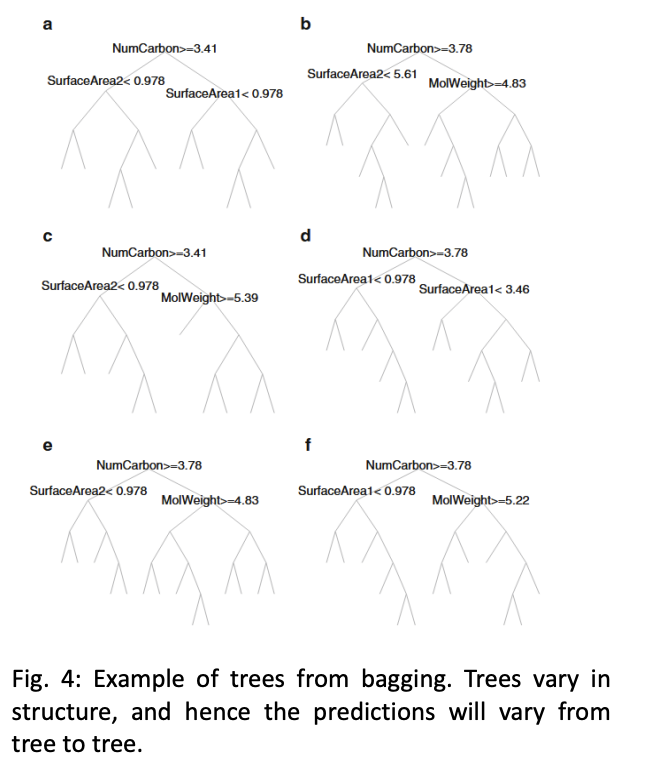 Bagging 特点🔗 通过 bootstrapping (有放回采样)来生成多个训练集 多个训练集大小相同,但样本不一定相同 某些样本可能在多个训练集中出现, 也可能不出现 未出现的样本被称为 out-of-bag 样本 不用从数据集分离测试集; 使用out-of-bag (OOB) 样本来评估模型 每个参与bagging的model产生一个预测, 最终的预测是所有预测的平均值/多数投票 降低了方差 可以并行计算 每个树最终都是独立的,但仍然存在一定的相关性 可以通过增加随机性来降低相关性 图示🔗